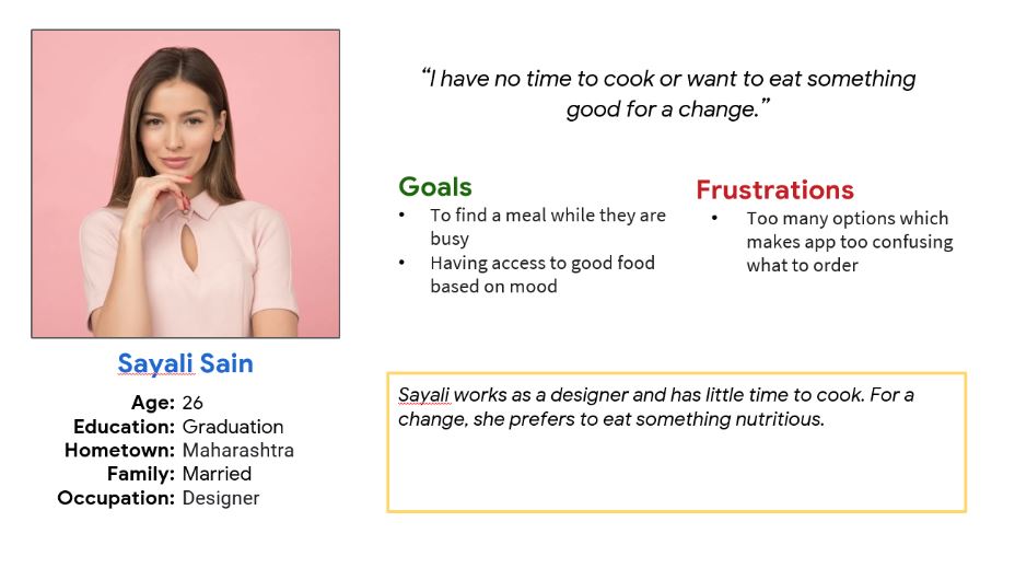 Sayali requires a fast and intuitive ordering process because she rarely has time to cook.