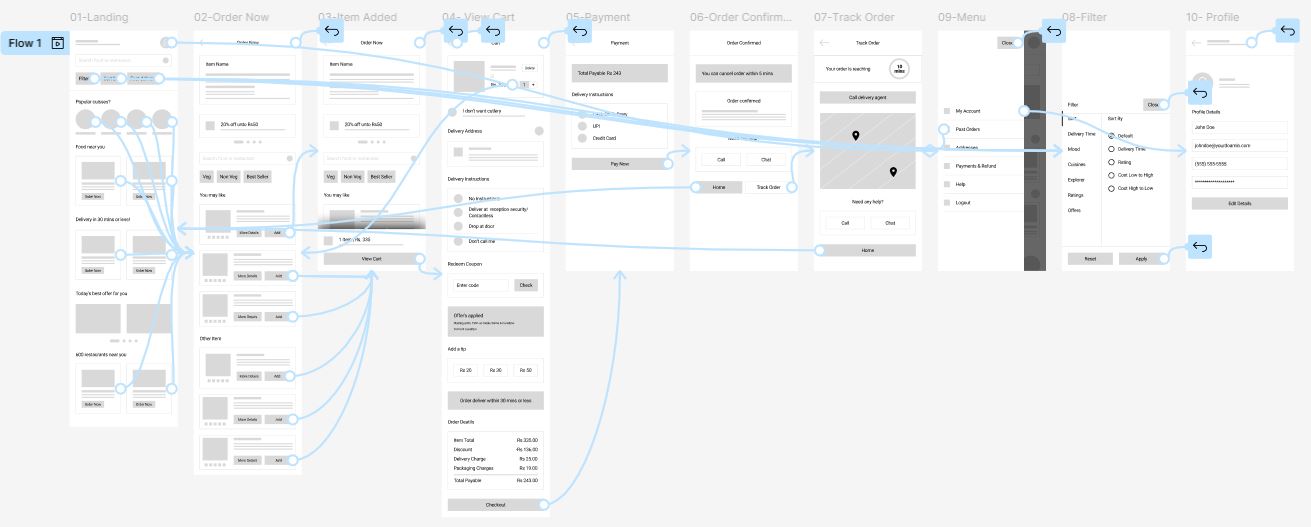 Mapped the primary flow of browsing, customizing, and ordering food for initial usability testing.